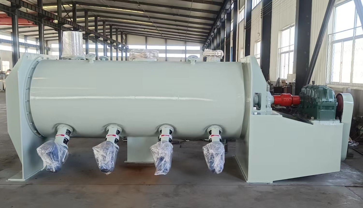 混合機結構主要由傳動部分、臥式筒體、犁刀組軸、飛刀組、出料閥、噴液裝置等組成。